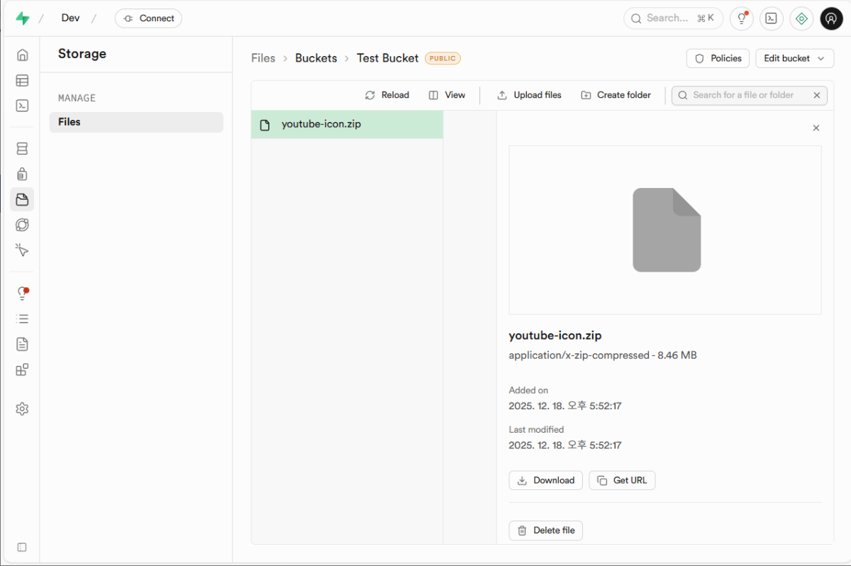 Supabase Storage를 사용하니 로컬 파일시스템을 직접 제어할 필요가 싹 사라졌습니다. 로컬 Docker 환경에서도 S3와 동일한 방식의 객체 스토리지를 사용할 수 있게 된 것이죠.